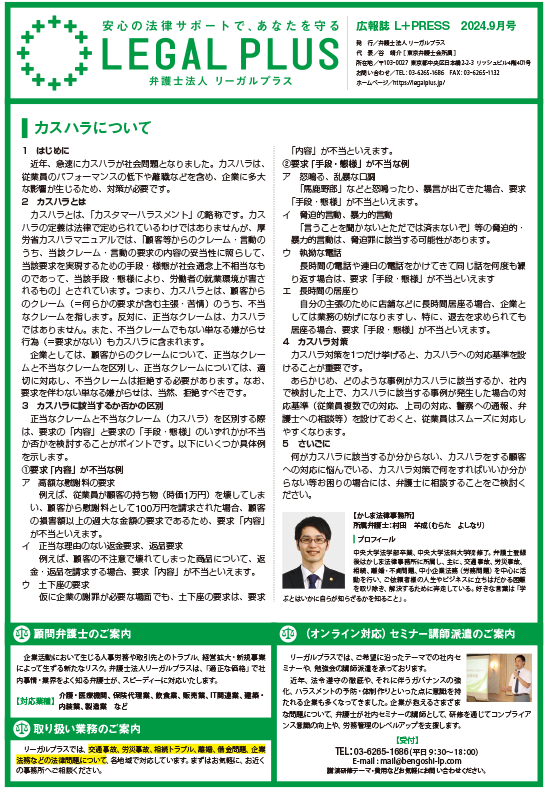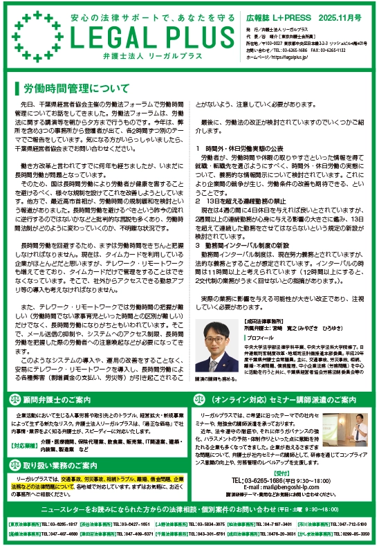 L+PRESS 2025年11月 コラム1:労働時間管理について コラム2:交通事故解決事例 L+PRESS 2025年10月 コラム1:民法改正で変わる養育費制度:企業が知っておくべき「法定養育費」と「先取特権」 コラム2:交通事故解決事例 L+PRESS 2025年9月 コラム1:解雇・雇止め・内定取消しについて コラム2:交通事故解決事例 L+PRESS 2025年7月 コラム1:第三者からの預貯金情報取得手続について コラム2:交通事故解決事例 L+PRESS 2025年6月 コラム1:道路交通法の改正について コラム2:生き別れとなっていた親の遺留分請求事件 L+PRESS 2025年5月 コラム1:父母の離婚後の子の養育に関する見直し コラム2:交通事故解決事例 L+PRESS 2025年4月 コラム1:相続登記の義務化に対する対応方法について コラム2:交通事故解決事例 L+PRESS 2025年3月 コラム1:労働時間管理の実務と法的留意点 コラム2:交通事故解決事例 L+PRESS 2025年2月 コラム1:高年齢者雇用安定法の継続雇用制度について コラム2:被相続人の生前の預金引出しを追及されて訴訟提起されたが、 抗弁事実を積み重ねて立証を尽くし、当方の全面勝訴で解決した事案 L+PRESS 2024年1月 コラム1:法改正「育児介護休業法等改正」 コラム2:交通事故解決事例 123456>