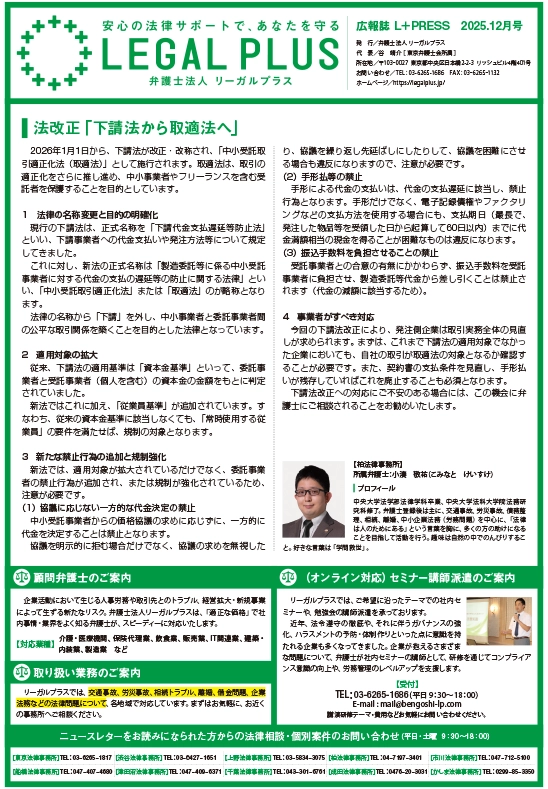 L+PRESS 2026年1月 コラム1:新しい譲渡担保・所有権留保法制 コラム2:交通事故解決事例 L+PRESS 2025年12月 コラム1:法改正「下請法から取適法へ」 コラム2:情報偏在型の遺産分割協議の解決事例 L+PRESS 2025年11月 コラム1:労働時間管理について コラム2:交通事故解決事例 L+PRESS 2025年10月 コラム1:民法改正で変わる養育費制度:企業が知っておくべき「法定養育費」と「先取特権」 コラム2:交通事故解決事例 L+PRESS 2025年9月 コラム1:解雇・雇止め・内定取消しについて コラム2:交通事故解決事例 L+PRESS 2025年7月 コラム1:第三者からの預貯金情報取得手続について コラム2:交通事故解決事例 L+PRESS 2025年6月 コラム1:道路交通法の改正について コラム2:生き別れとなっていた親の遺留分請求事件 L+PRESS 2025年5月 コラム1:父母の離婚後の子の養育に関する見直し コラム2:交通事故解決事例 L+PRESS 2025年4月 コラム1:相続登記の義務化に対する対応方法について コラム2:交通事故解決事例 L+PRESS 2025年3月 コラム1:労働時間管理の実務と法的留意点 コラム2:交通事故解決事例 123456>